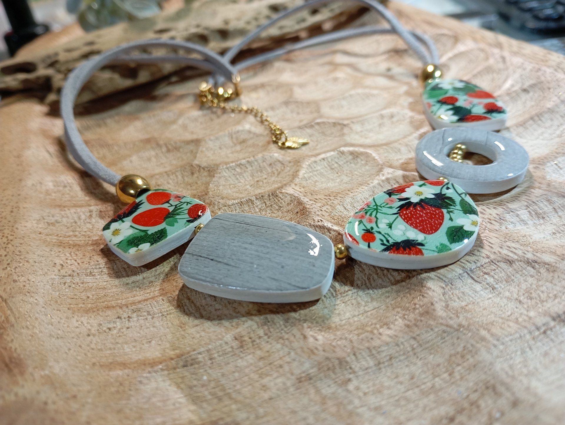 Pour sublimer les couleurs vibrantes du motif "Fraises & Fleurs", chaque pièce est scellée sous une épaisse couche de résine haute brillance. Ce fini "glaçage" donne au bijou une profondeur incroyable et un aspect lisse comme de la porcelaine, tout en protégeant durablement le décor des frottements et de la lumière.