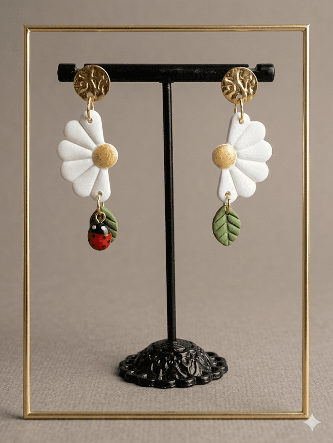 Un duo printanier plein de charme. Ces boucles d'oreilles marguerites et coccinelles sont modelées à la main en argile polymère. Ce modèle a été élu "Coup de cœur" par ma communauté lors d'un récent sondage ! Un bijou léger, unique et poétique.