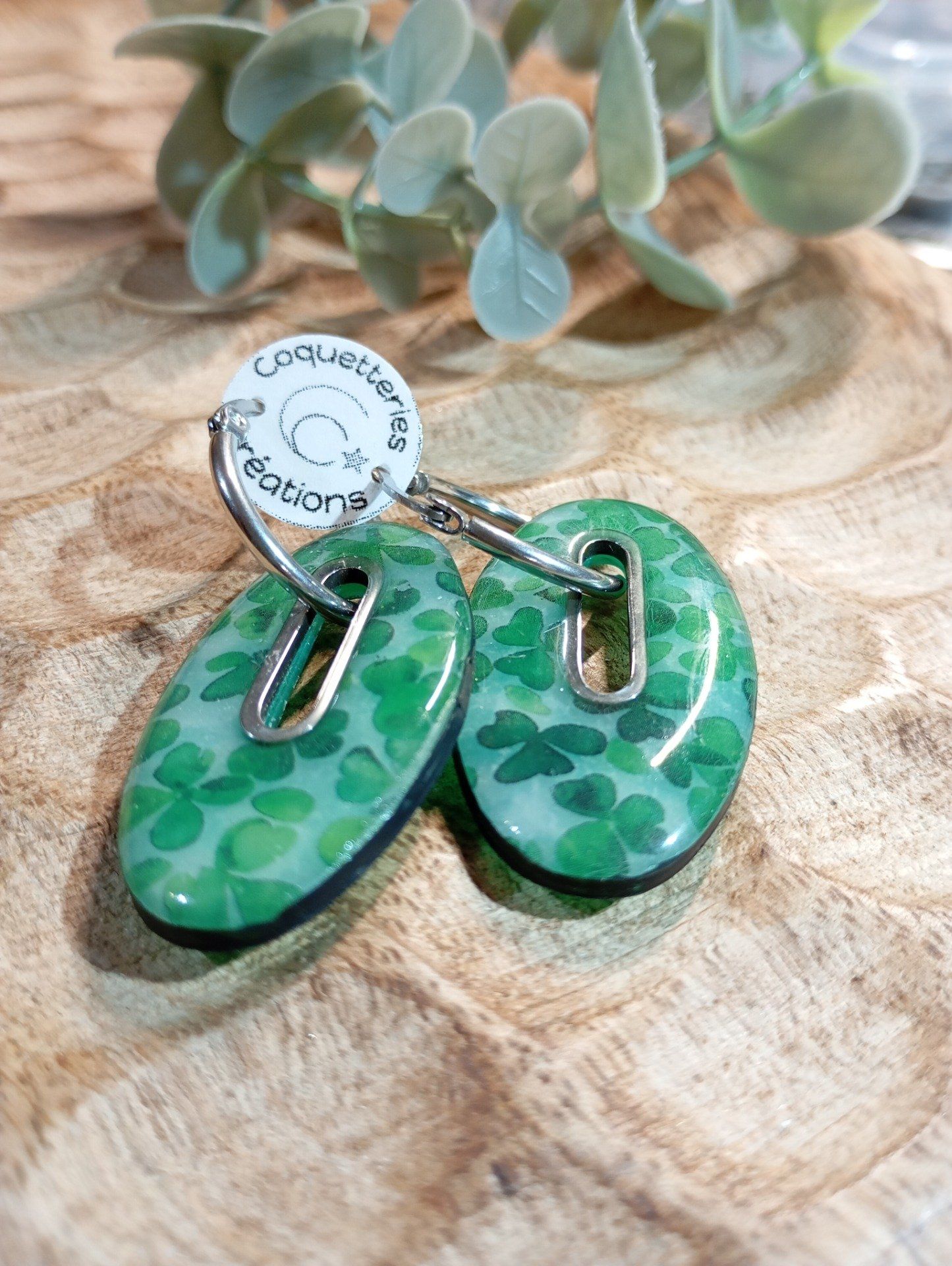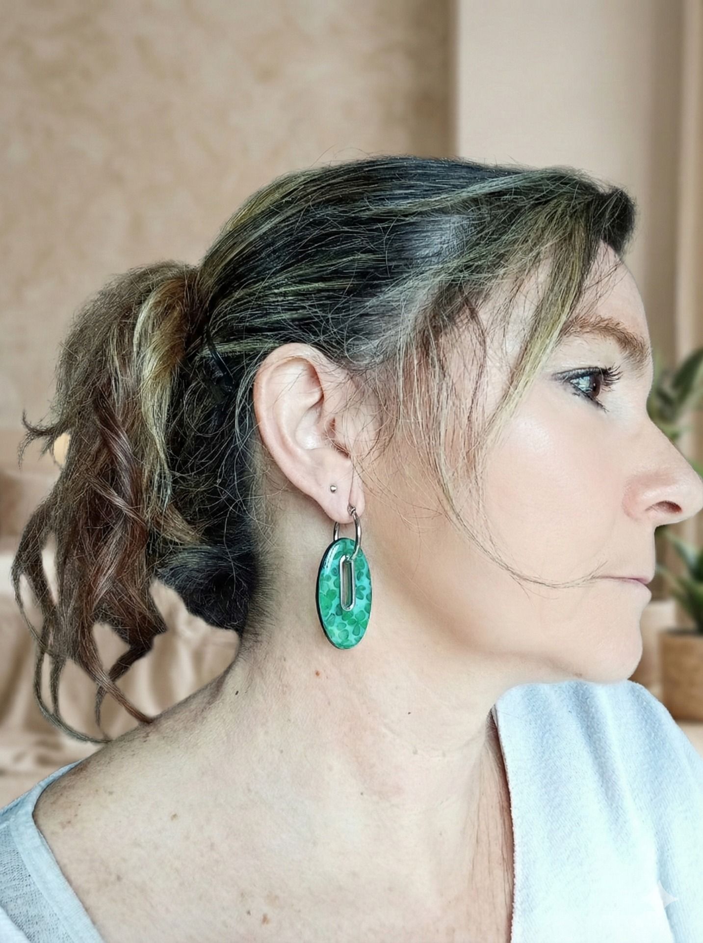 Découvrez notre collection "Trèfle de Chance", une ode à la nature et à la sérénité. Loin des bijoux classiques, ces boucles d'oreilles utilisent la technique de la polymère translucide. Ce matériau laisse passer la lumière, donnant au motif trèfle une profondeur fascinante, presque organique, comme si la plante était capturée dans la matière.