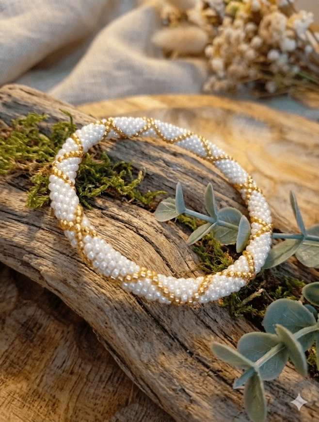 Le Design : Blanc & Or Ce modèle présente un motif en croisillons dorés sur un fond blanc pur, créant un effet de résille précieux. C'est le bijou "peau nue" idéal pour l'été, mais aussi un accessoire chic pour réveiller une tenue d'hiver sombre. Au toucher, la texture des perles est incroyablement douce et fluide.