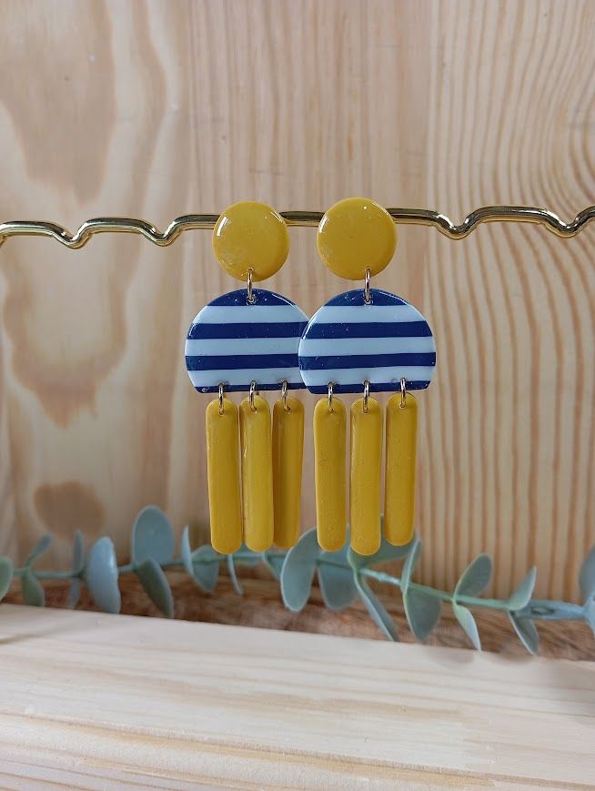 Inspirées par l'élégance intemporelle des rayures marinières françaises, ces boucles d'oreilles réinterprètent le style marin avec une touche moderne et géométrique. Chaque paire se compose d'un clou d'oreille rond uni, surmonté d'une demi-lune aux rayures bleu marine et blanches impeccables. Trois dangles cylindriques pendants assortis complètent cette silhouette lumineuse, apportant fluidité, mouvement et une audace bienvenue à votre style.