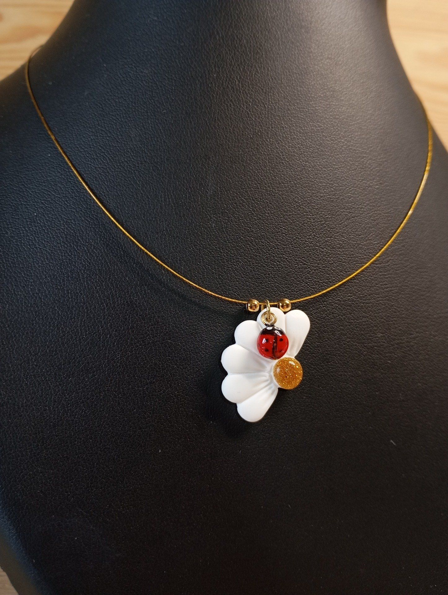 En tant qu'artisane d'art, je façonne chaque pétale de la marguerite et chaque minuscule coccinelle avec une précision extrême. Le cœur de la fleur est rehaussé de fines paillettes dorées pour capter la lumière. Ce travail minutieux en argile polymère garantit non seulement un niveau de détail exceptionnel, mais aussi une légèreté incomparable pour un confort optimal tout au long de la journée.